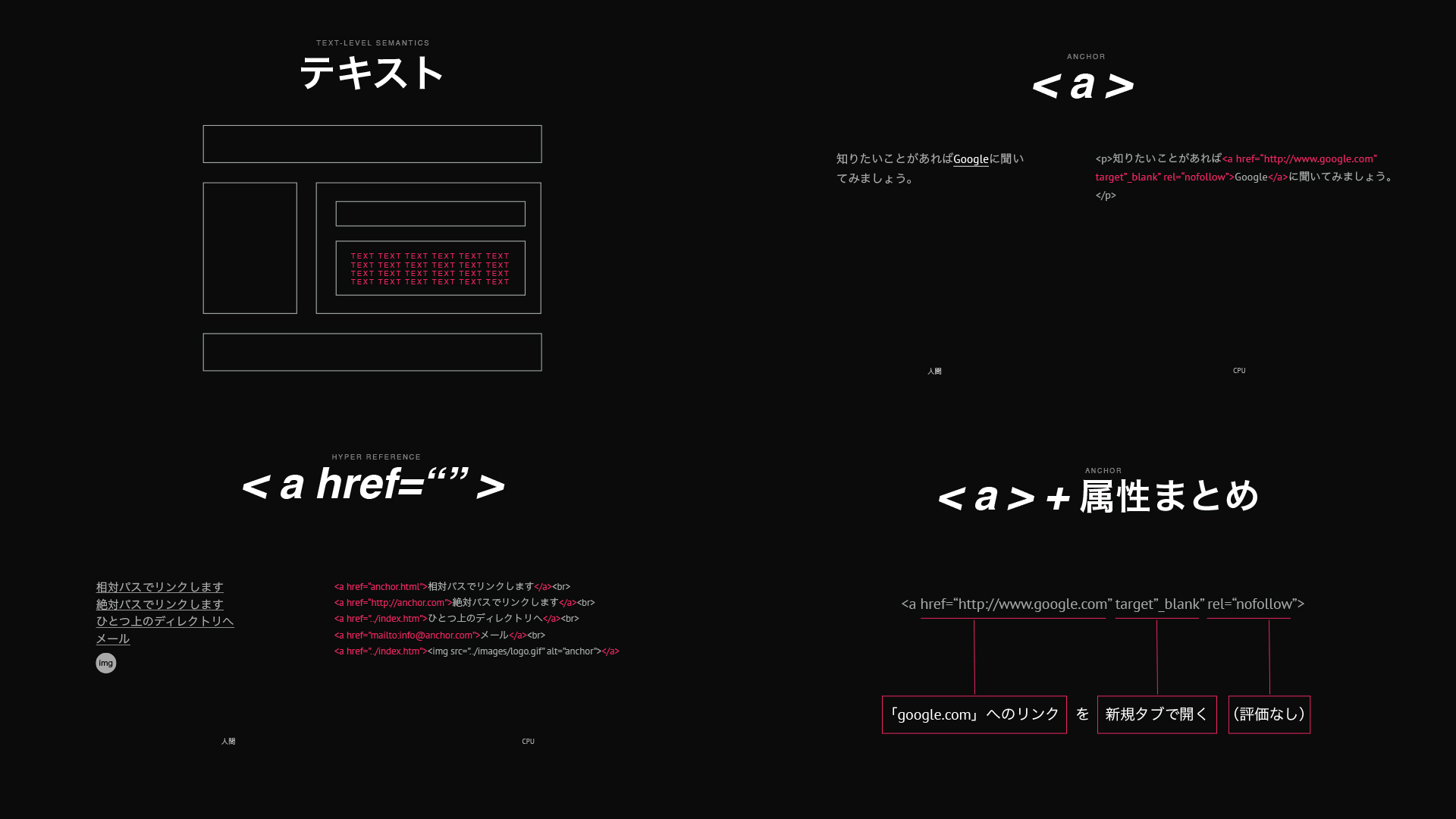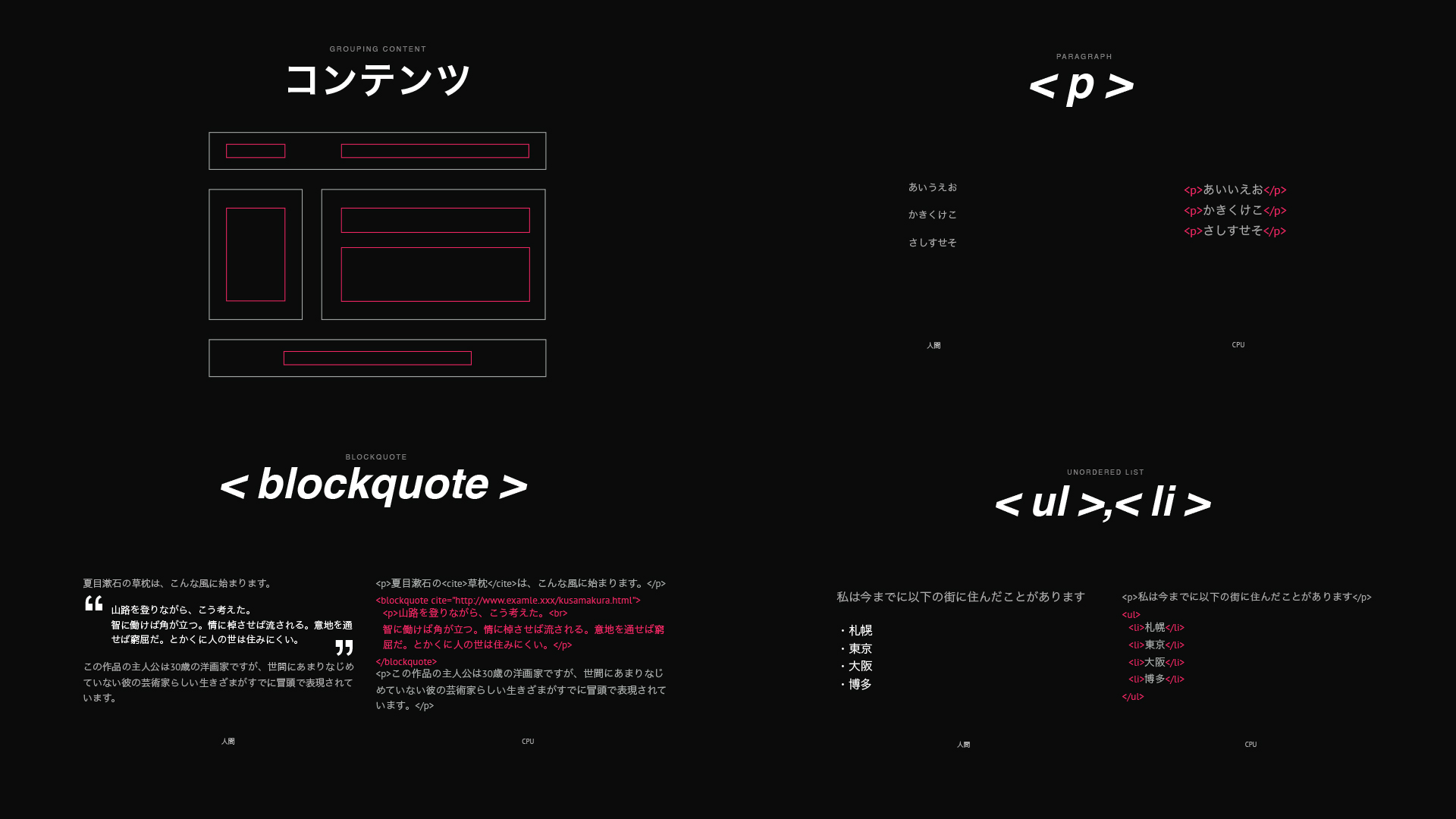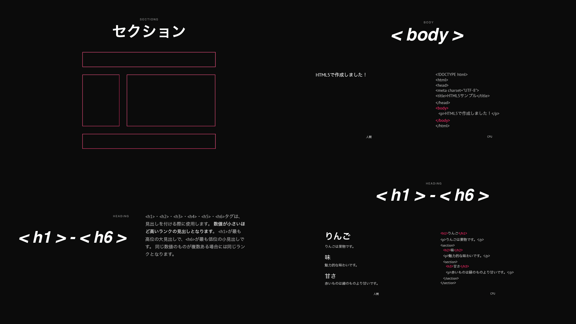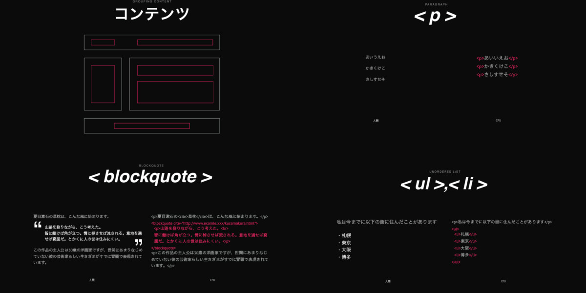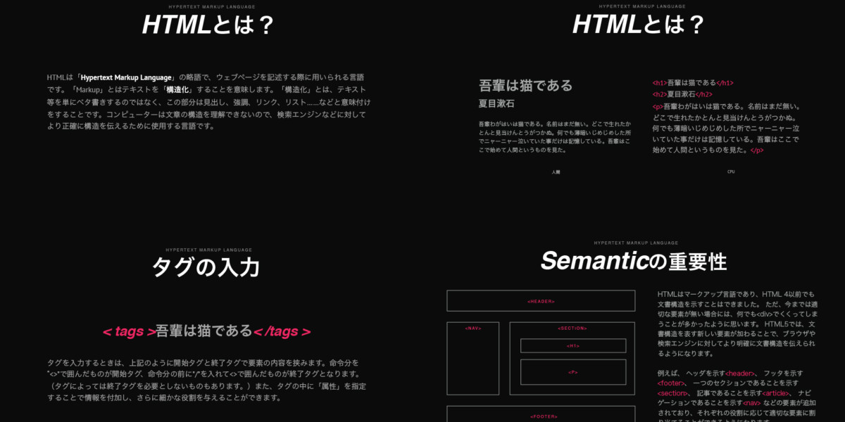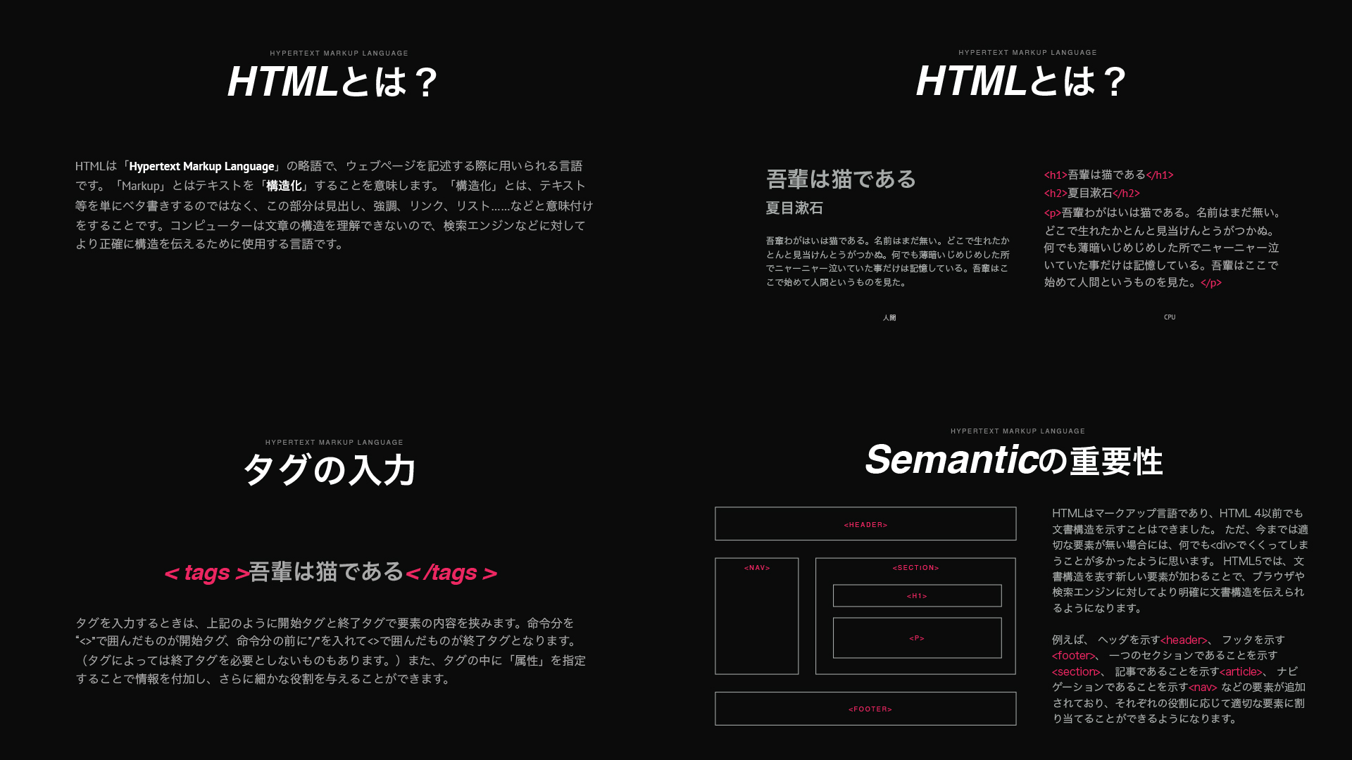 コーディングの経験がなくてもHTML5におけるセマンティックマークアップが理解できるように作成。コンテンツの企画・設計、スライドデザイン、登壇を担当。