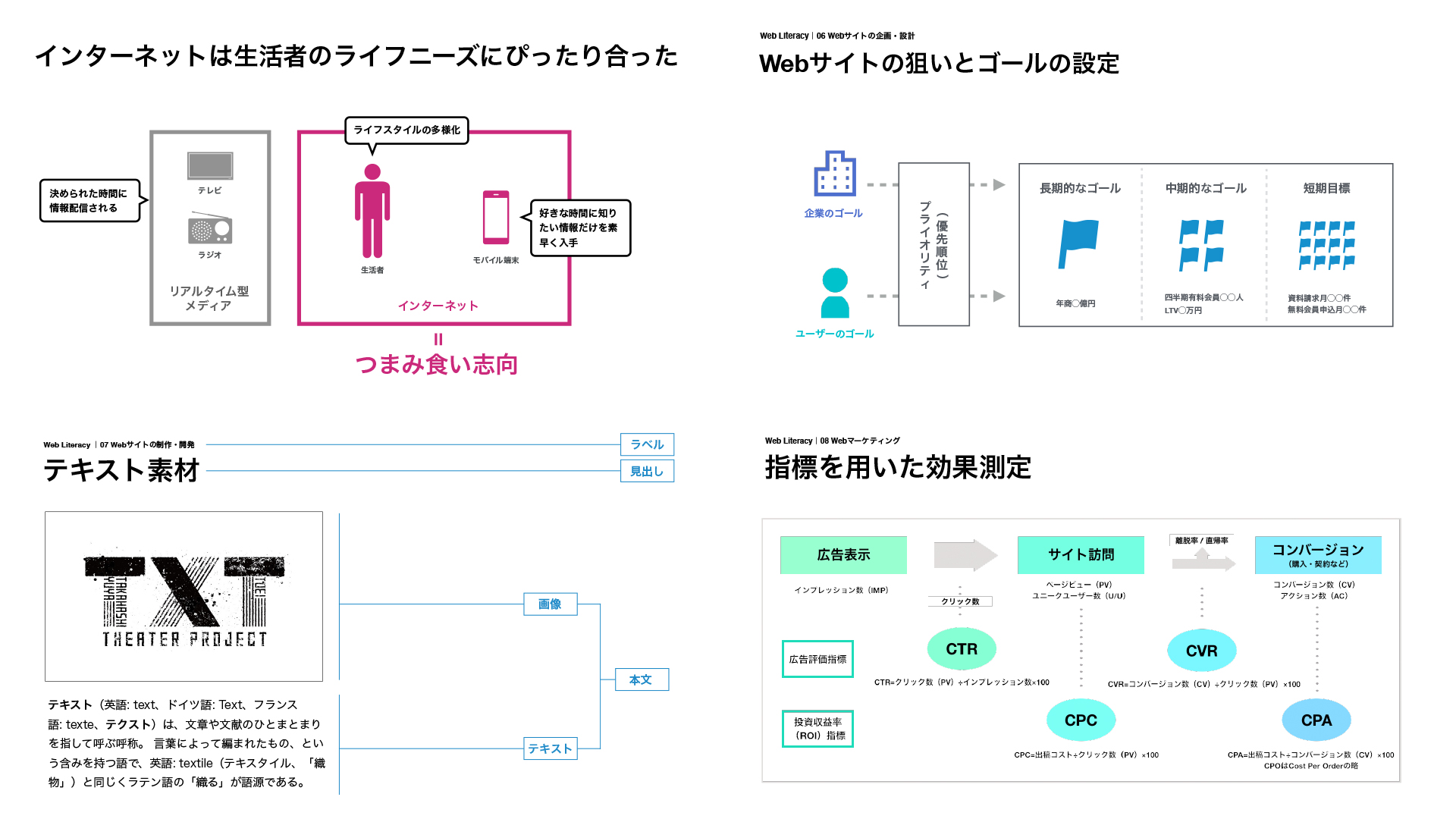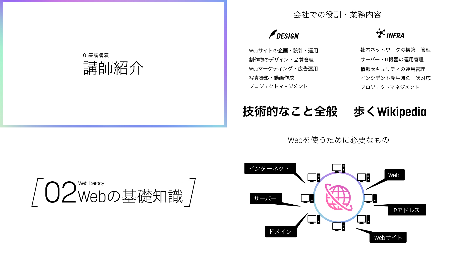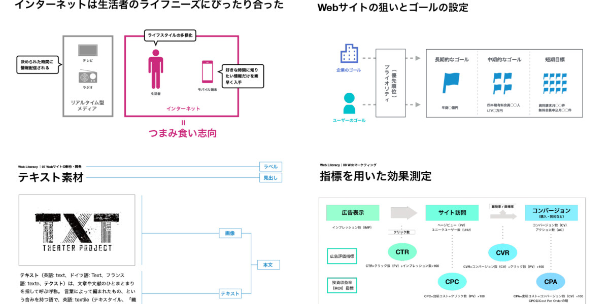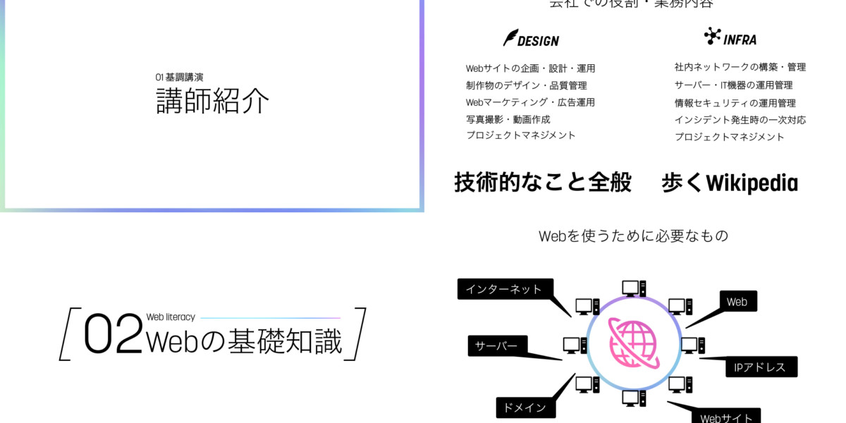 Web literacy training Web業界初心者を対象とした「Webリテラシー」研修シリーズ。 カリキュラム構成、コンテンツの企画・設計、スライドデザインの作成、登壇を担当。恒久性があり最短1時間の短期研修から最長40時間の長期研修まで対応する。 主な内容は「Webの基礎知識・応用・問題点」「インターネットビジネス」「Webサイトの企画・設計」「Webデザイン・実装」「Webマーケティング」など。 CATEGORIESDESIGN, TRAINING
