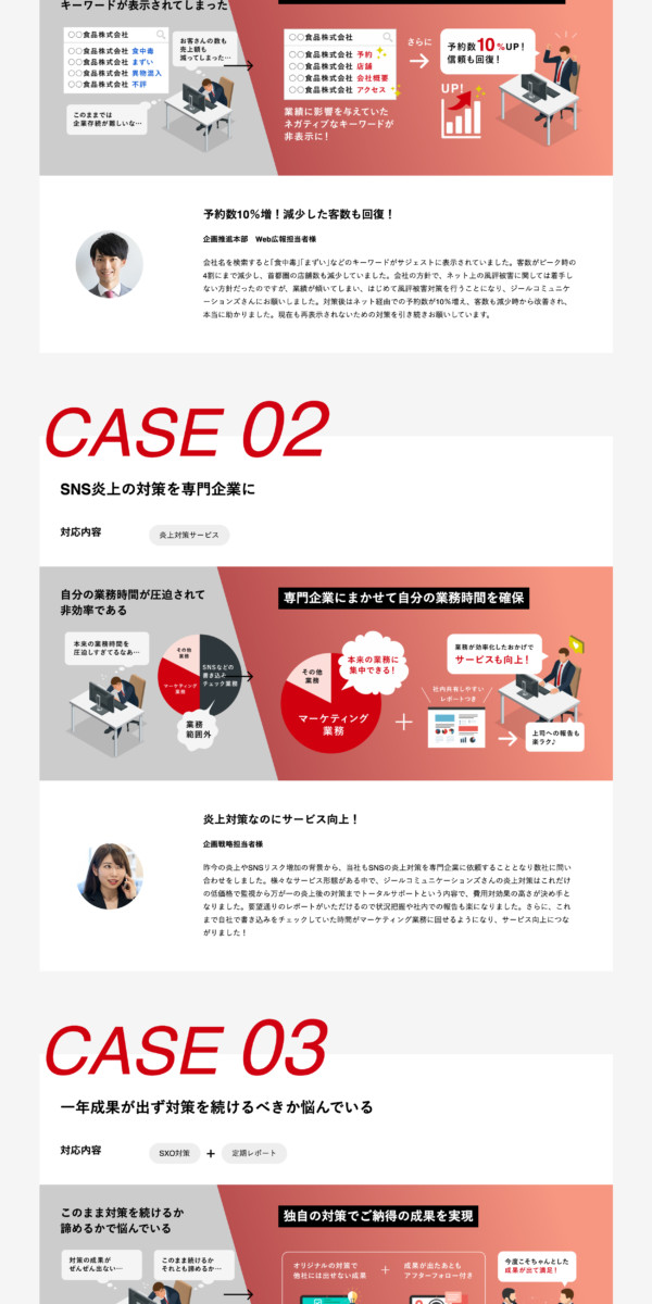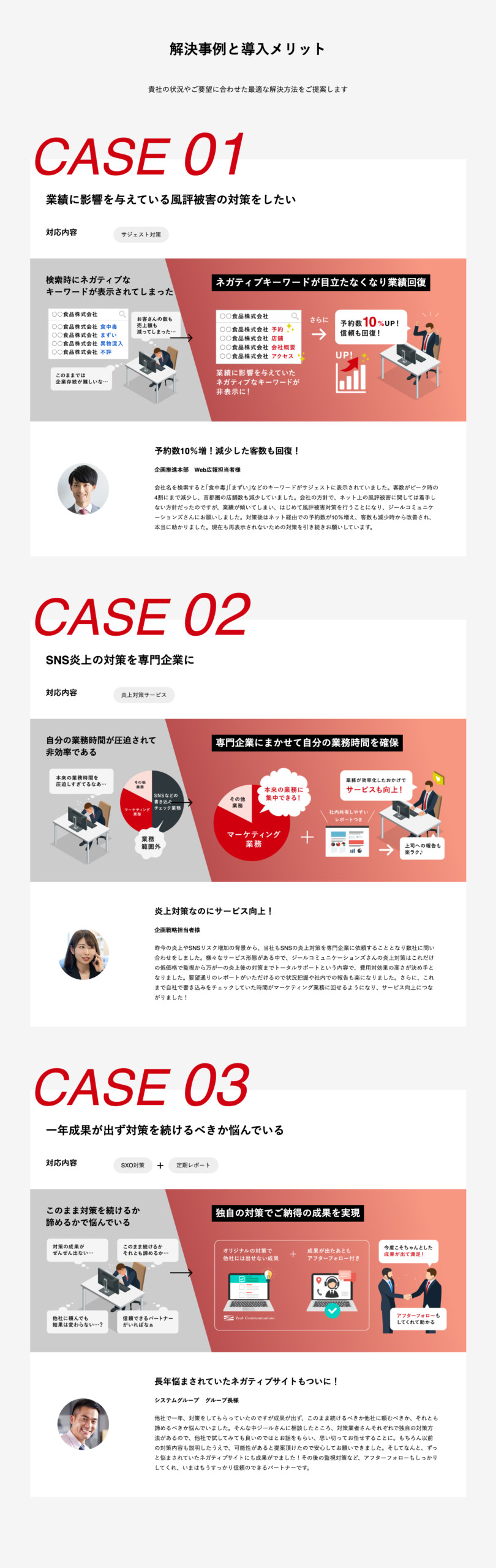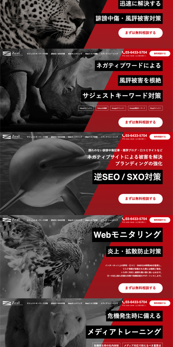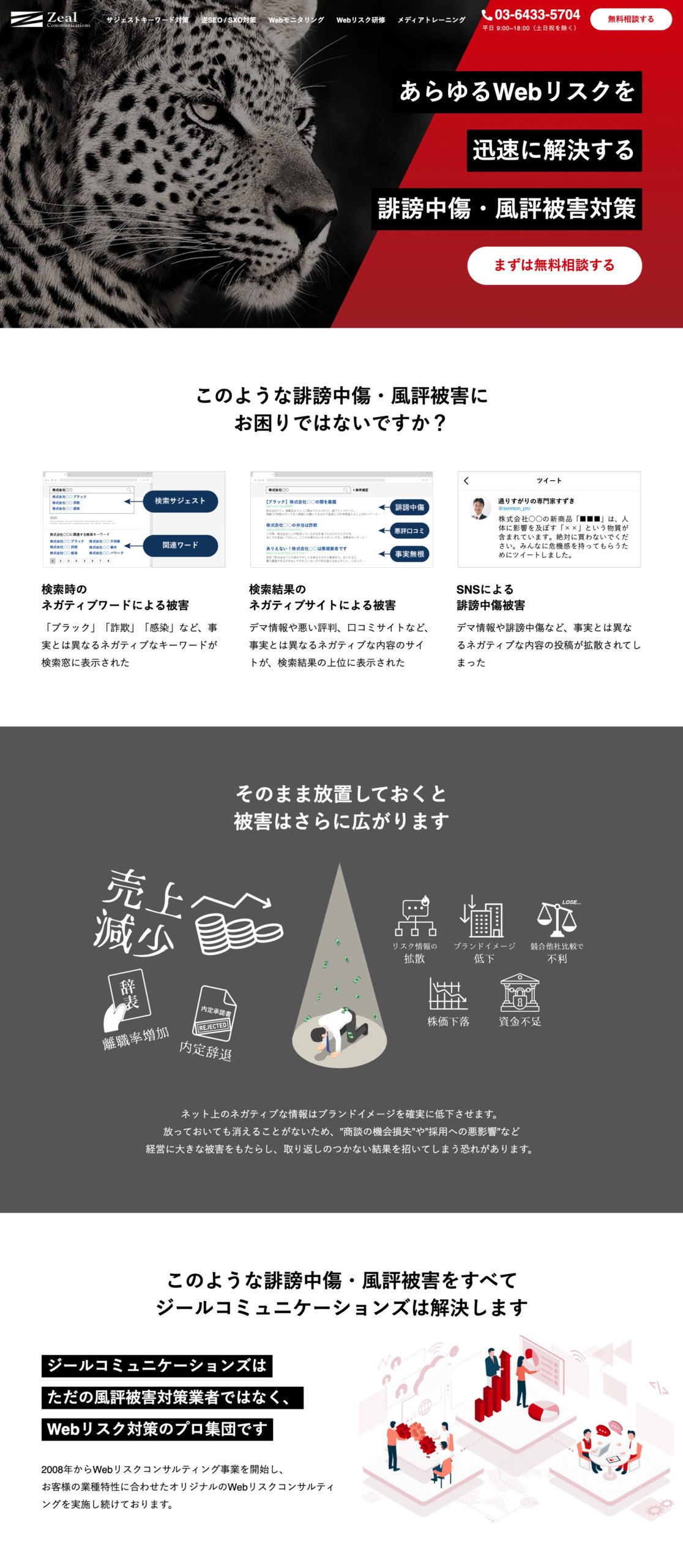 Zeal Communications Landing Page ジールコミュニケーションズ社Webリスクソリューション事業のリスティング広告による集客を目的としたWebサイト。 マーケティング戦略の立案、トーンアンドマナー・ビジュアルデザインの作成、ディレクション全般、グロースハックを主としたマーケティング業務を担当。 プロトタイプをリリース後、サービス設計と連動して各種サービスに該当するページの設計とリスティング広告によるターゲティングのオペレーション化を実施した。 CATEGORIESDESIGN, DIRECTION, MARKETING